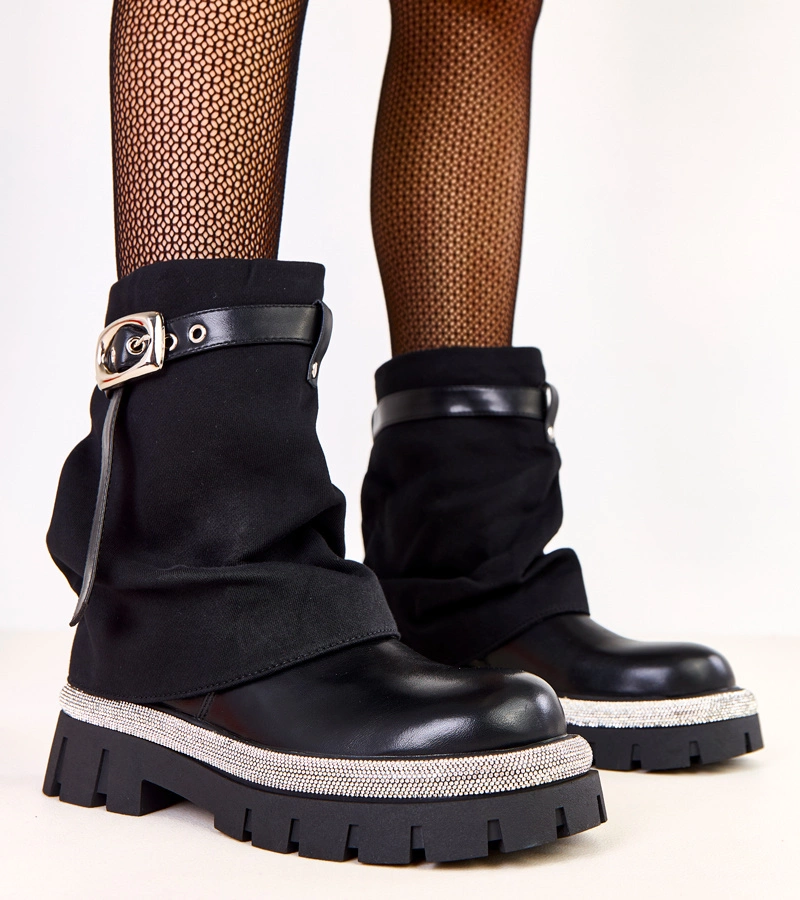 Botine negre cu manșetă întoarsă și cu zirconii pe margini Yemi