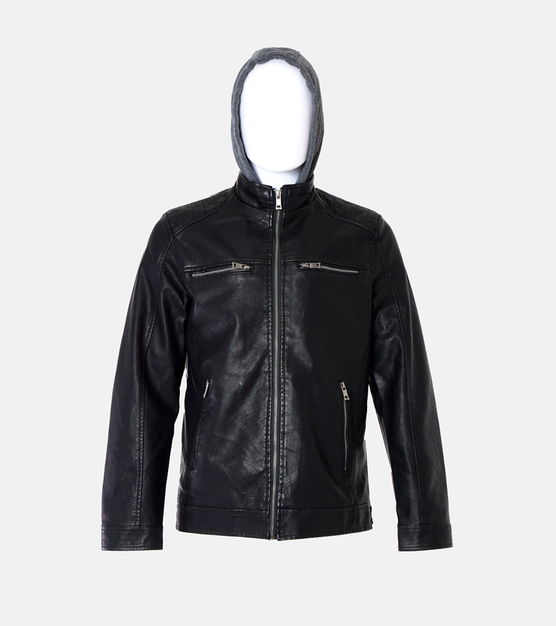 Jachetă neagră din piele artificială Leverett pentru bărbați, de culoare neagră