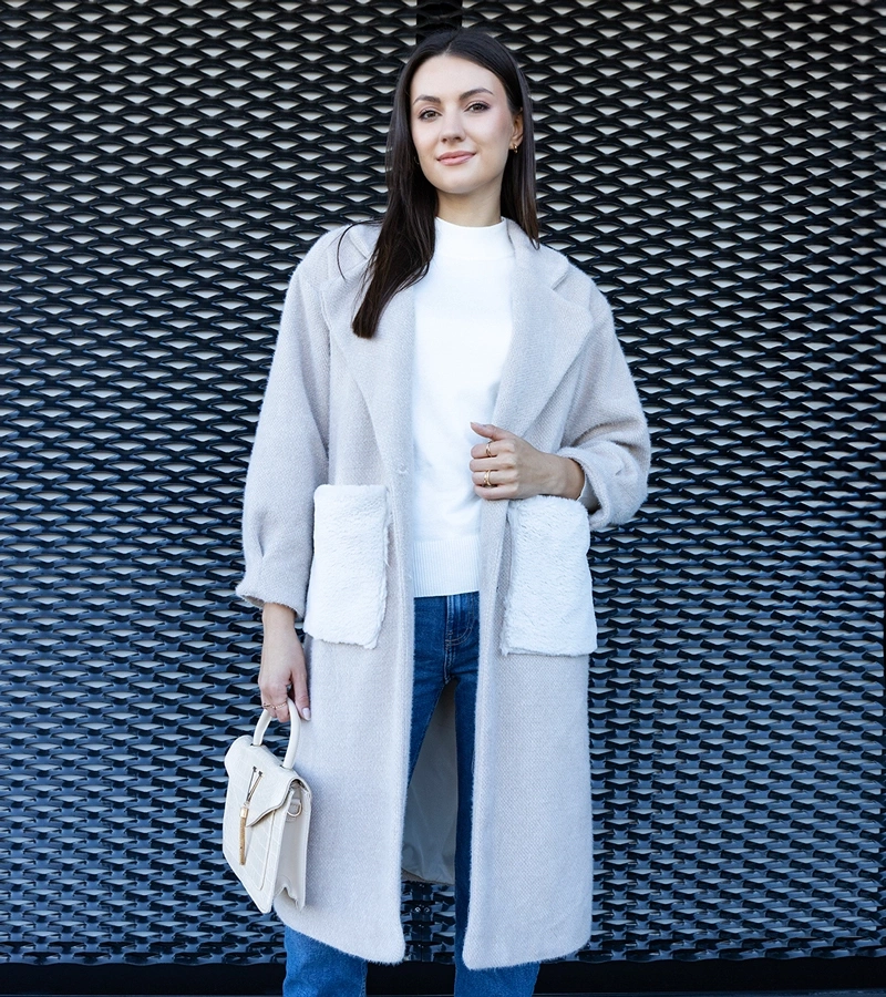 Pardesiu lung bej cu buzunare din pluș Badra.