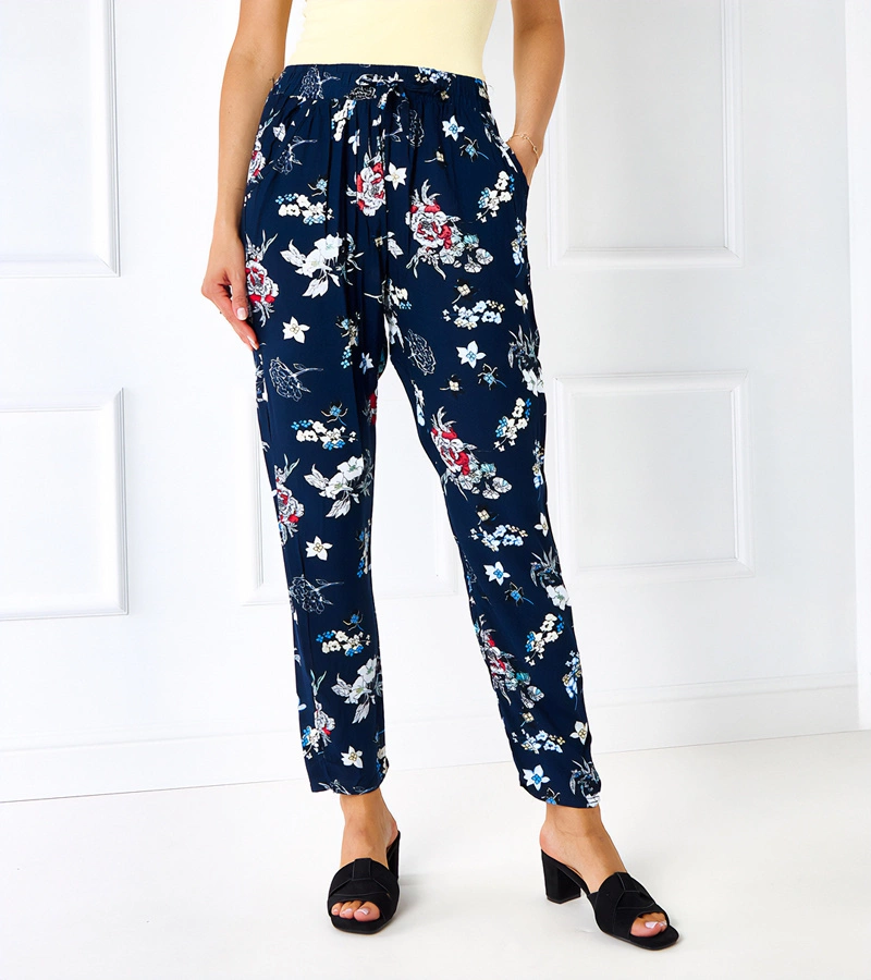 Granatowe spodnie w kwiaty Bazzi po rumuńsku to: **Pantaloni bleumarin cu flori Bazzi**.