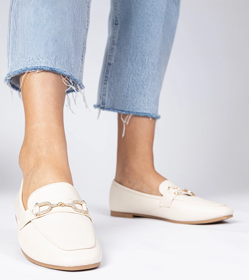 Mocasini eleganți bej cu ornament auriu și pietre strălucitoare Kalisa