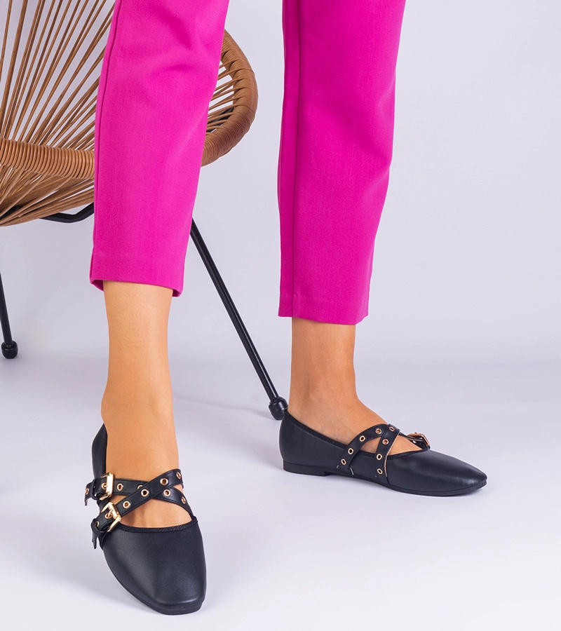 Balerini negri din piele ecologică decorați cu catarame Emmarino