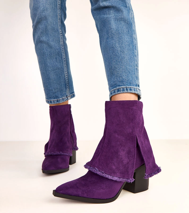 Botine din piele întoarsă violet cu toc subțire și încrețituri Friela
