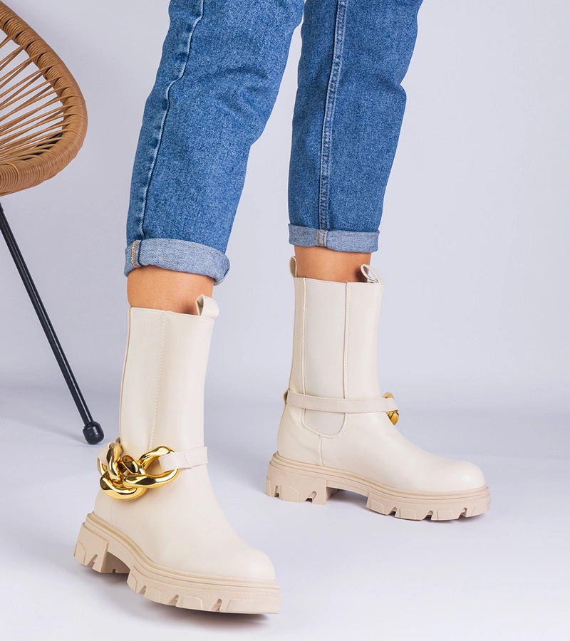 Florende botine bej până la gleznă decorate cu un lanț masiv