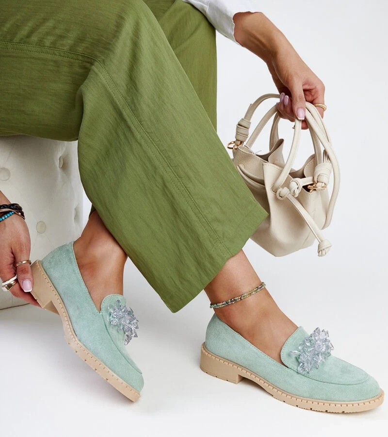 Mocasini de piele de antilopă verde deschis cu cristale Zemzem