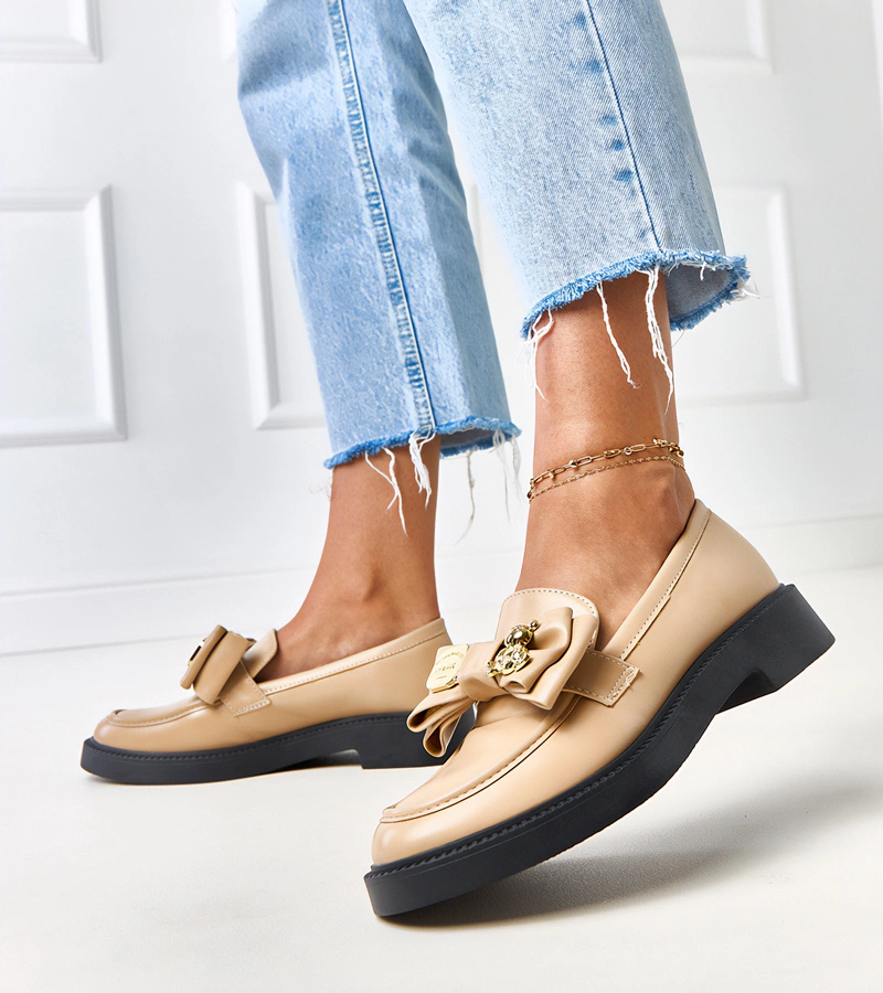 Mocasini bej pentru femei din piele ecologică întoarsă cu fundă Sarina