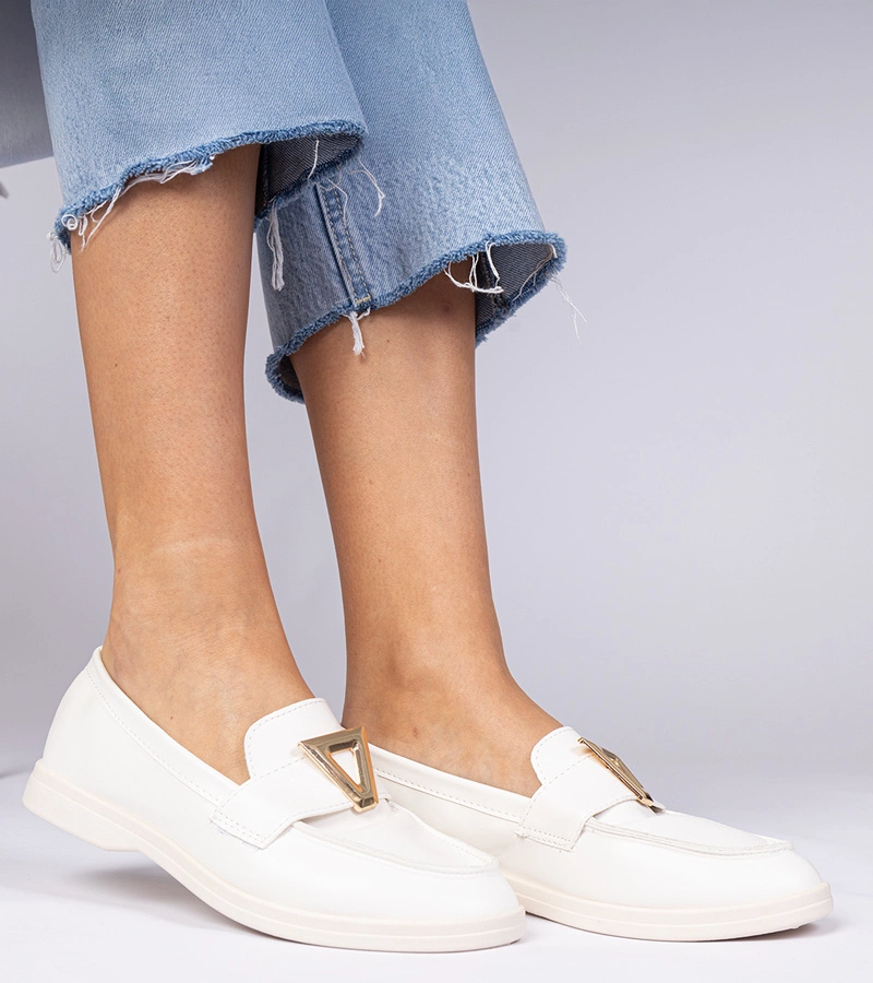 Pantofi mocasini albi de damă cu decorațiune aurie Senna