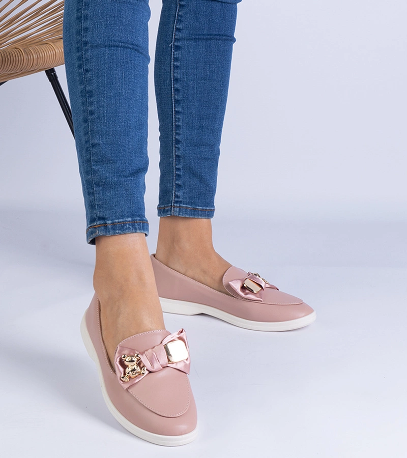 Mocasini roz cu fundiță și ursuleț auriu Nensi