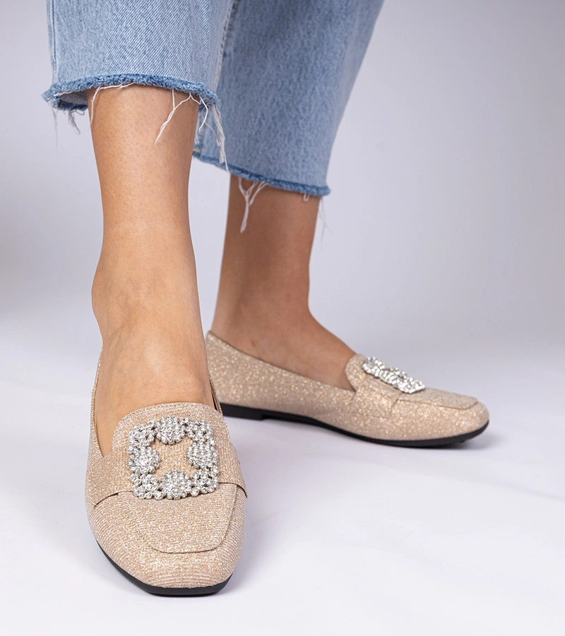 Mocasini strălucitori șampanie cu sclipici și zirconii Sawelia