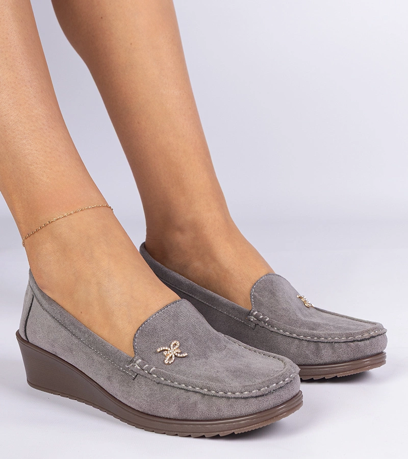 Sarimi pantofi mocasini gri pentru femei pe pană din piele ecologică