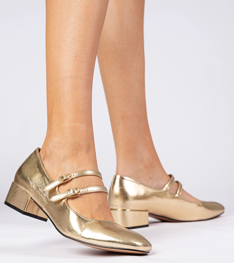 Pantofi aurii lăcuiți cu toc gros și catarame Kamola