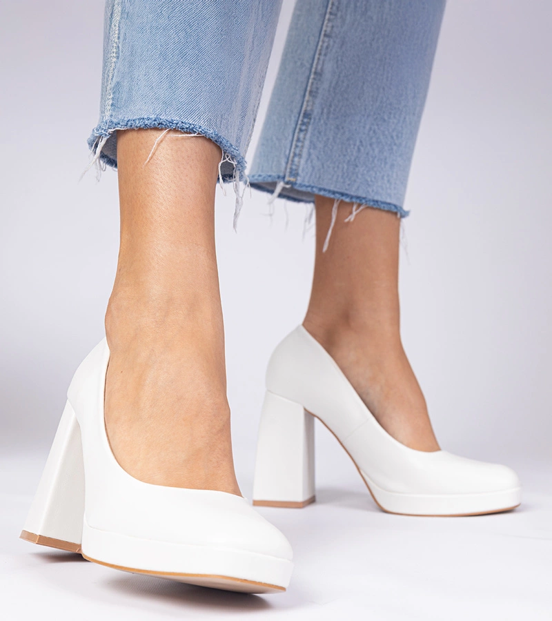 Pantofi albi cu toc masiv și vârf pătrat Irenois