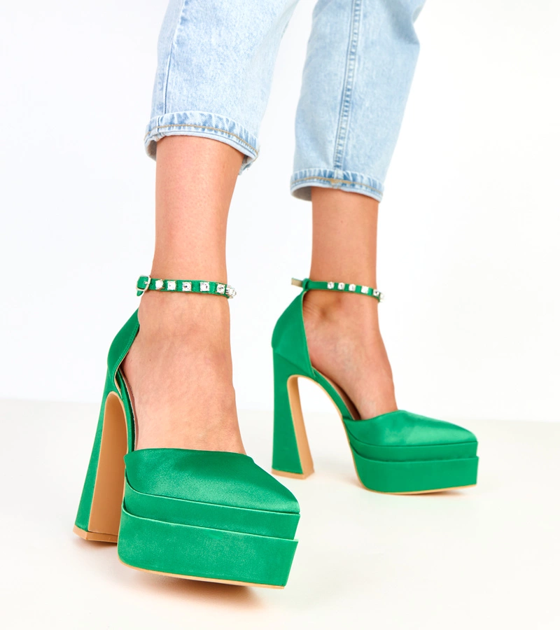 Pantofi verzi din satin cu toc, decorați cu zirconii Fugatto