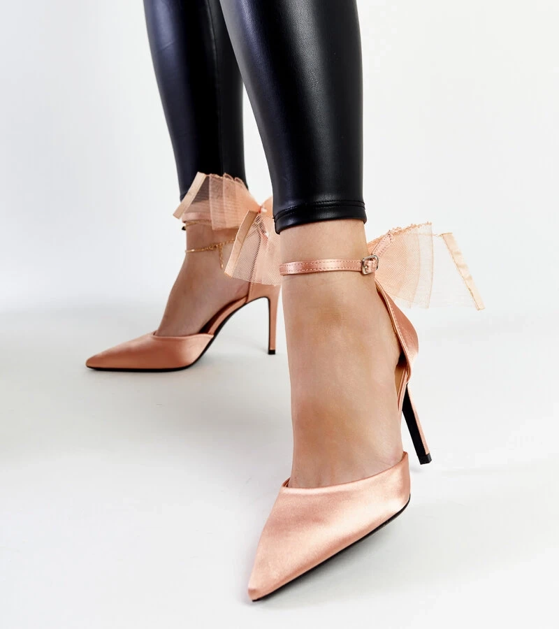 Pantofi stiletto roz din satin cu fundiță de Madonna
