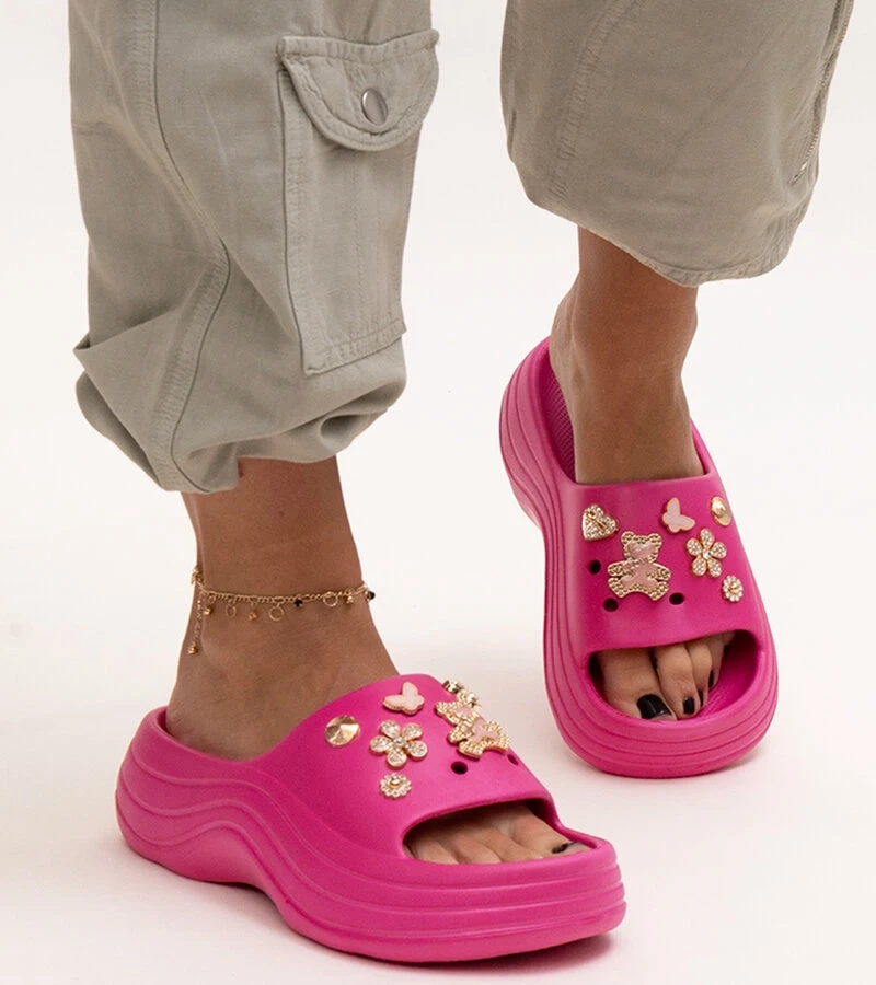 Șlapii de plajă Dorene roz, matlasați și împodobiți cu ornamente