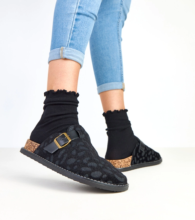 Papuci negri de damă pe platformă de plută decorați cu model leopard Diane