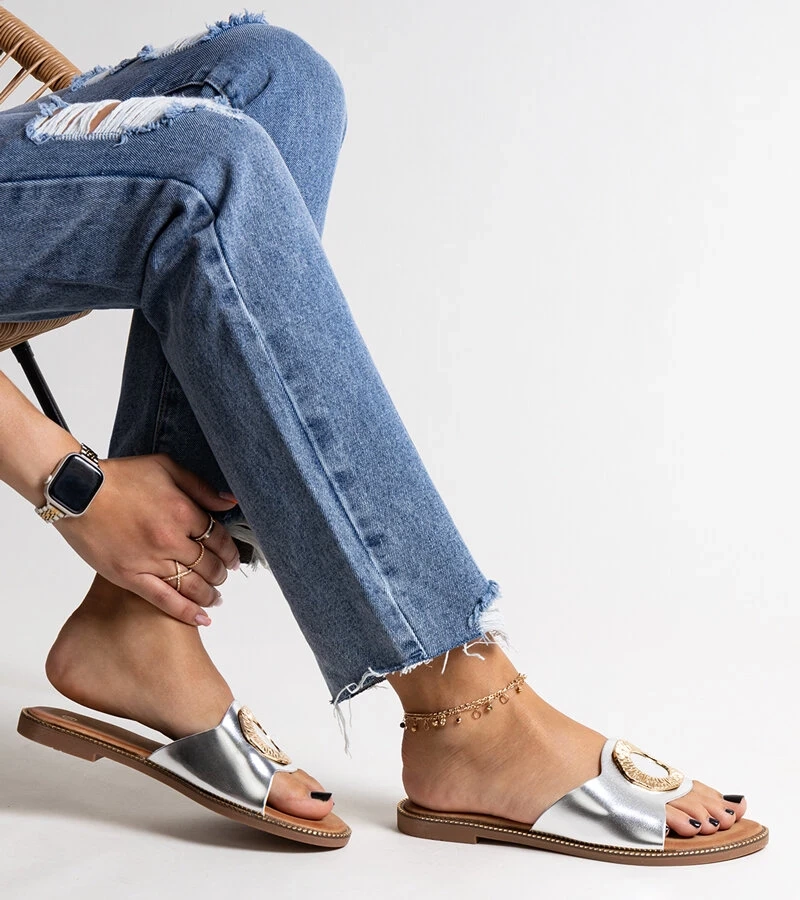 Papuci negri din piele ecologică cu accesorii aurii Drahomíra