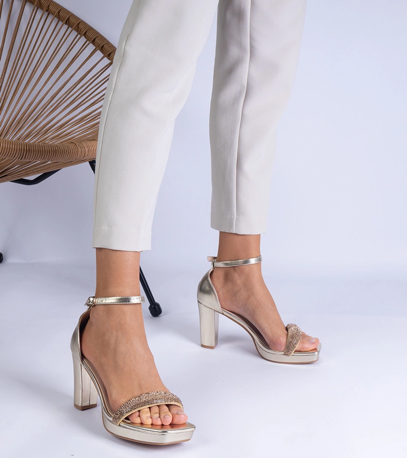 Sandale elegante aurii cu toc gros și pietre strălucitoare Beltusto