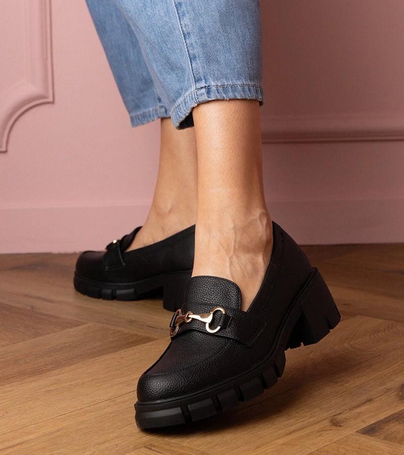 Pantofi negri cu toc mic și ornament auriu Marela