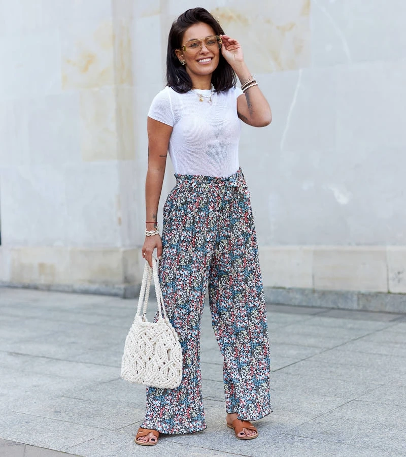 Pantaloni Latifa cu pliuri largi, alb și verde, pentru femei